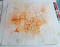 Completely different from Jenny's canvas but I've used the same steps - layering strips of torn paper and embossing paste through a stencil covered by gesso and sprayed with inks.