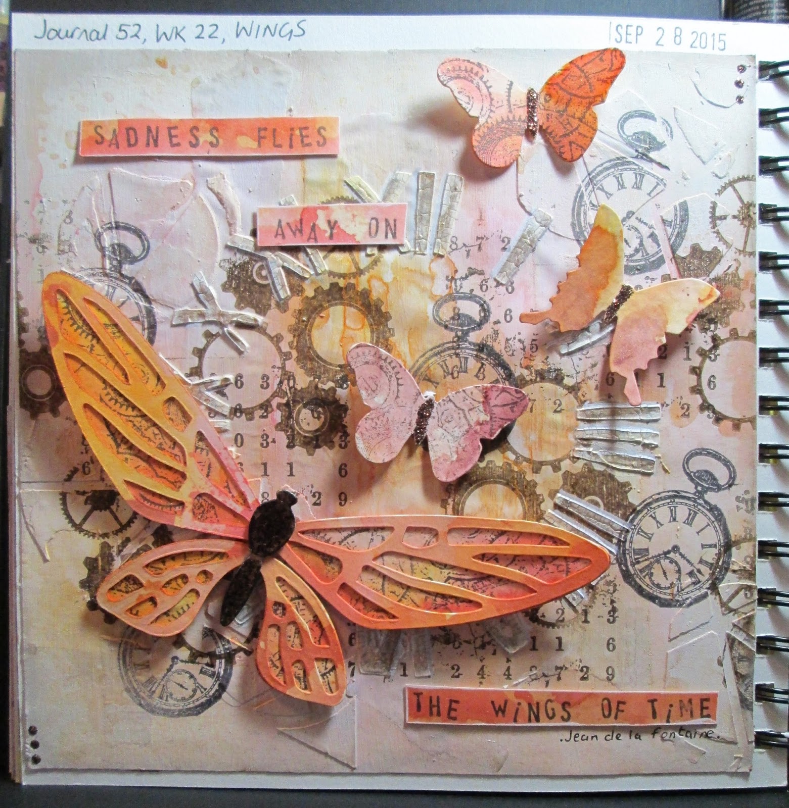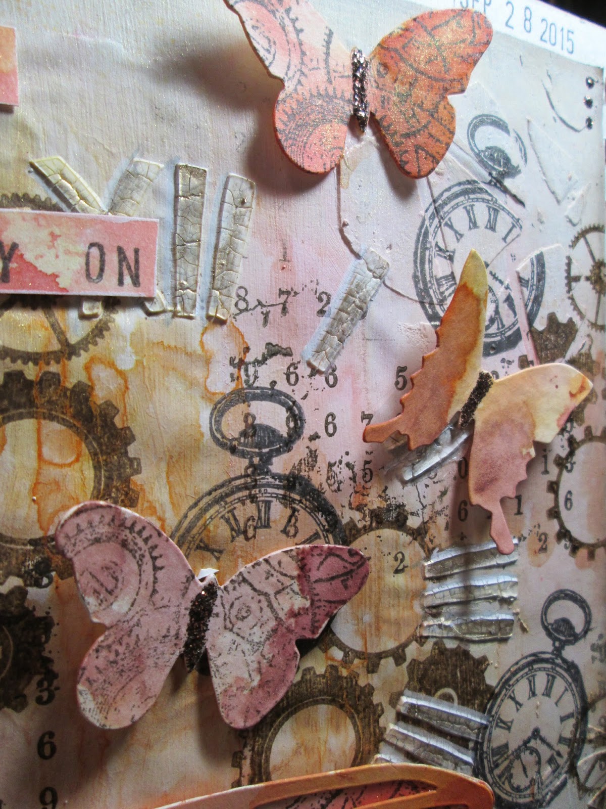 ReplyDeleteI think your results show that you can still be absolutely inspired by the ideas and techniques in the magazine, while turning them to your own style and creations - what a stunning journal page. I love the warm peachy colours and the fabulous textured clock face - and those butterflies are just beautiful.