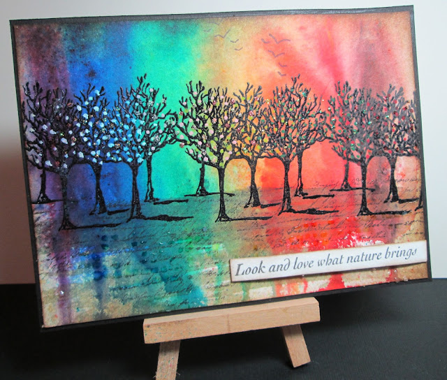 I stamped and embossed the trees first on water colour card. I used a paint brush to 'paint' water in a strip, sprinkled the first Brusho colour and as it was drying moved on to repeat for each strip so the colours gently blended at the edges. When all the colours were done I sprayed with more water, held the card up to allow the colour to run. Once it was all dry I painted a rough wash of walnut stain distress ink across the bottom half and added some stamping with a script stamp.