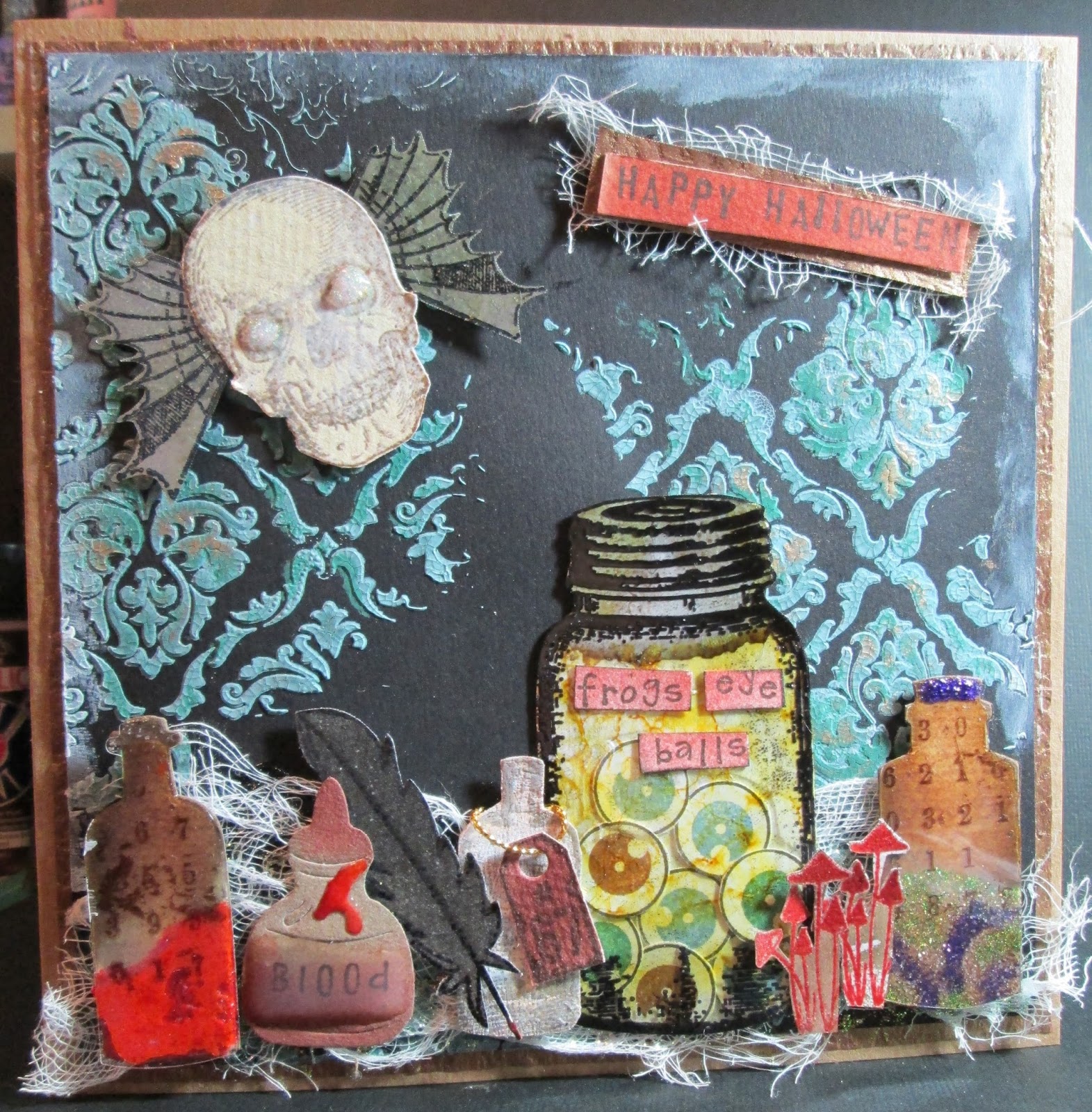 The jar of frogs eyes are stamped eyes sandwiched between stamped (Artistic Stamper) jars - one is stamped and embossed on a layer of acetate coloured with alcohol ink and the other behind it is on white card.