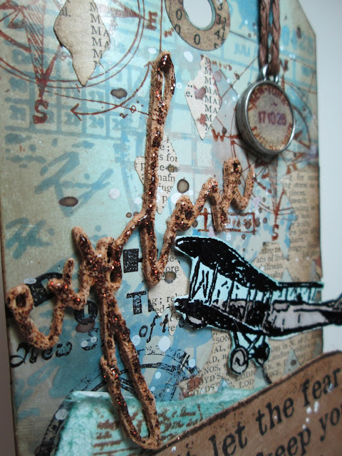 I also layered on old book page die cut with Sizzix mixed media die, cork die cut sentiment, stamped and fussy cut plane and of course the main sentiment to which I added splats of Dylusions ink spray and cinnamon stickles.