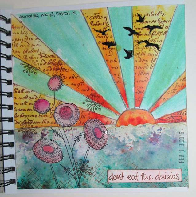 I began by placing a Heidi Swapp stencil on my page and sprinkled Brushos through in brilliant red, orange, yellow and lemon. Leaving the stencil in place, once dry I stamped over the brusho colour with a text stamp and then applied microglaze (Juddikins) to seal the colour before removing the stencil. I then built up the rest of the page applying tumbled glass distress stain between the 'rays' - (applying the microglaze allowed me to do this without picking up colour from the Brushos) and sticking another piece of water colour paper coloured with Brusho to the bottom section. The birds are stencilled using ranger transparent gloss texture paste mixed with a little black paint