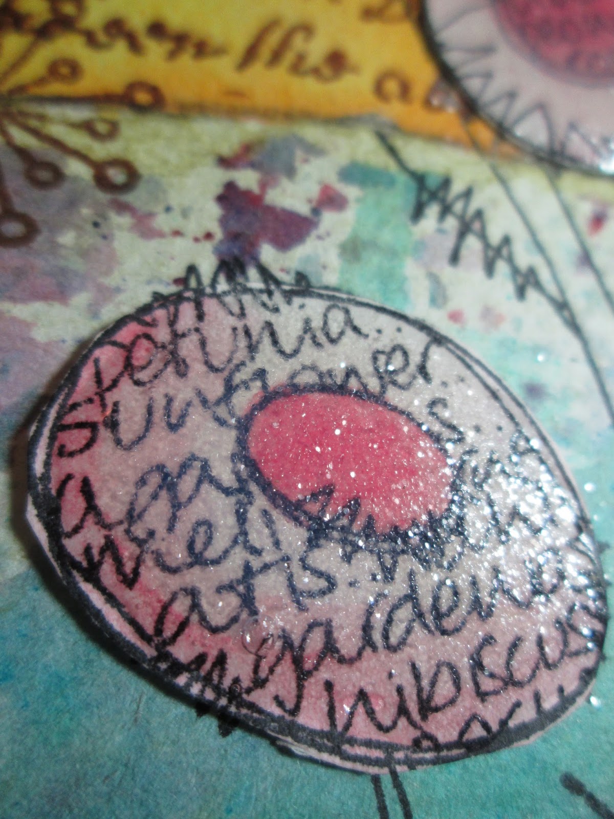 The page was looking a little quirky to me so I thought the JOFY stamps from PaperArtsy worked great. I stamped them directly onto the page and then stamped again and fussy cut the 'flowers' which I then coloured with Derwent Inktense pencils. I applied glossy accents to the flowers and sprinkled some glitter in while wet - you can almost see it in the pic. A bit of random stamping with another couple of stamps from the JOFY range and I was done.