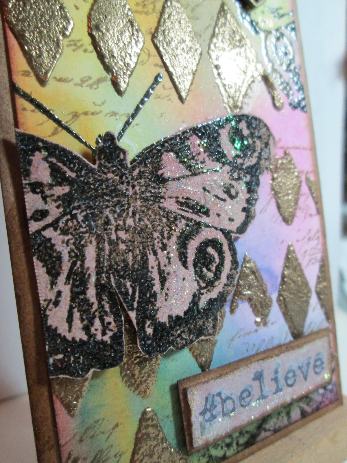 I started with a background of distress inks using fresh, bright Spring colours (in the hope Spring might actually show some signs of arriving). I stamped this with a Butterfly and some script. Tim's technique is layering texture paste through a stencil and adding embossing powder on top which I've done here (after masking the butterflies). I used Gold detail EP and I love the extra depth and texture you get.