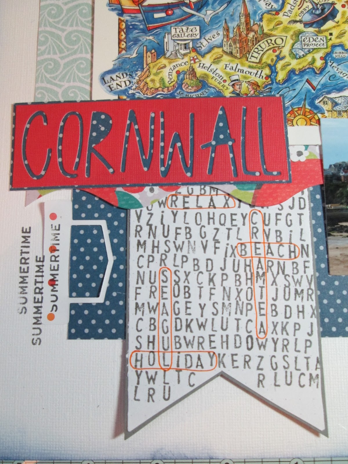 My Title is the negative from using individual die cutting letters and backing with patterned paper. The word search banner is inspired by challenge three at Counterfeit Kit - Played in the Shade (word games). I used tiny letter stamps and then drew round the words I'd stamped in orange pen.