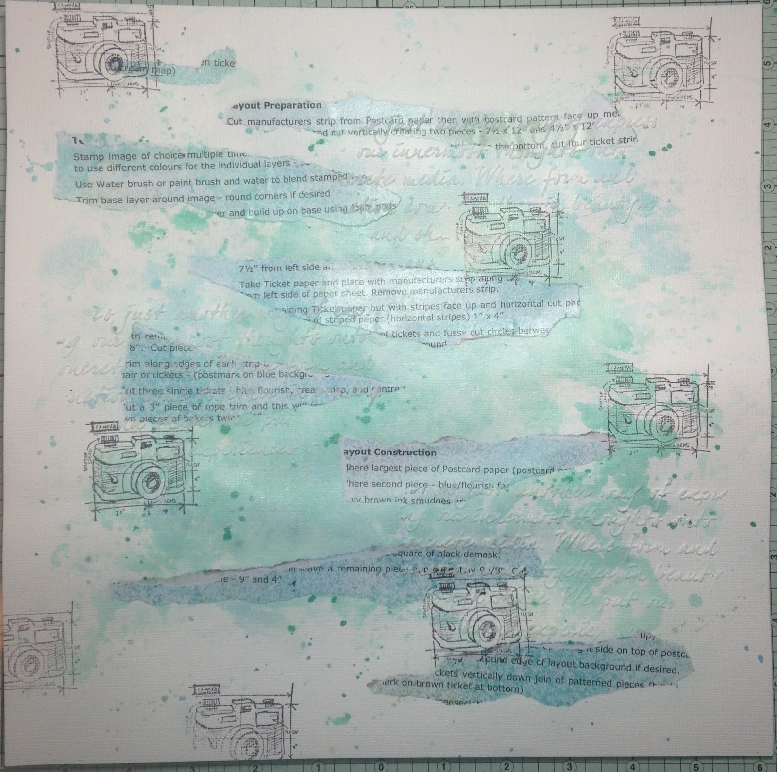 I created this background for my second layout - using lots of Heidi Swapp colour shine, torn strips from the written instructions for one of my classes, stamping and texture paste through a stencil. I then added my photos and embellishments. The blanked out picture was taken during my first class and a couple of delegates asked me not to share it online.