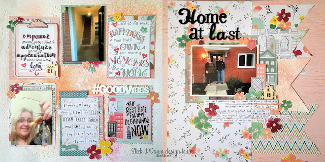 I also created my own mixed media background with texture paste through a stencil and spritzing with Heidi Shine sprays. The photos were taken when we completed the purchase of our new house, and I've added some quotes that a friend had written in the New Home Card she gave us.